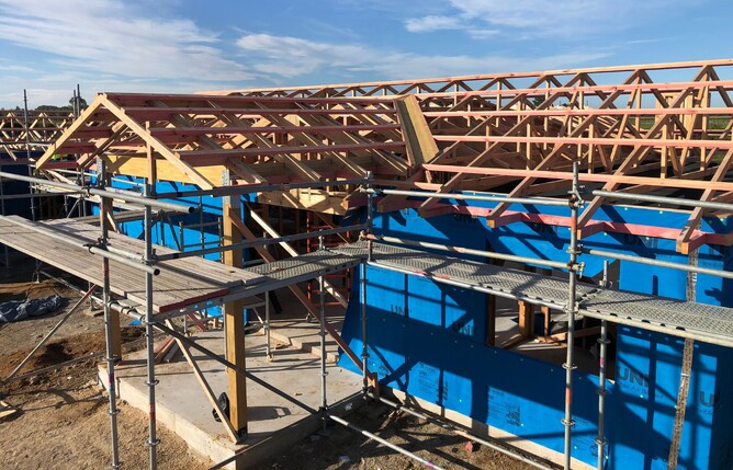 Once the concrete was set, the Roger Ramsey Building team hit the ground running and were straight into framing, including standing the large chimney frames and lifting the beams into place. During this phase, the new aluminium joinery was measured up too.